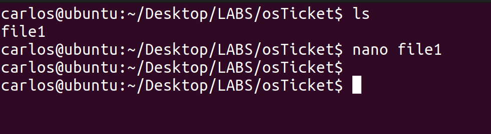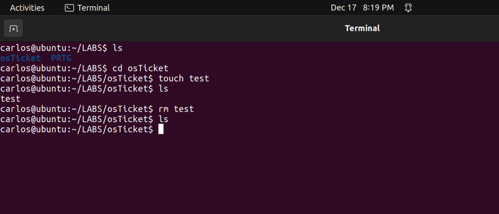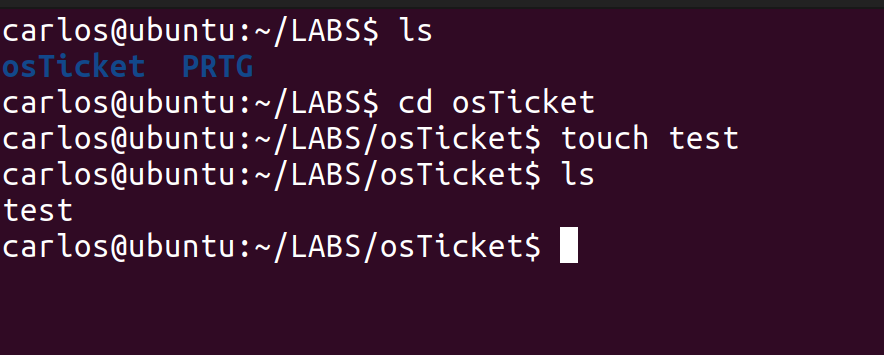 In the image above, we created a file called “test” using the command “touch” within the osTicket directory. The touch command allows you to create an empty file if it doesn’t already exist.