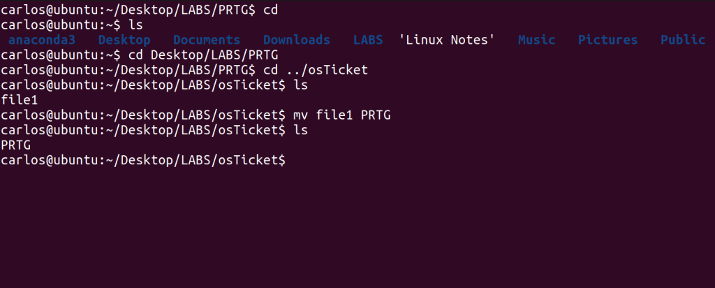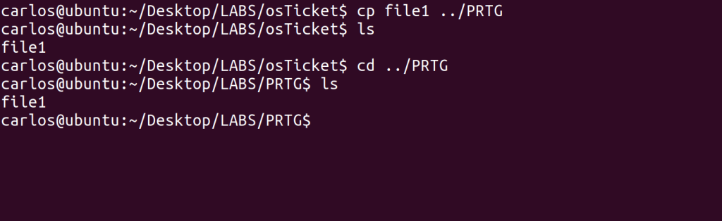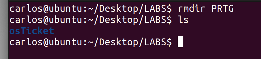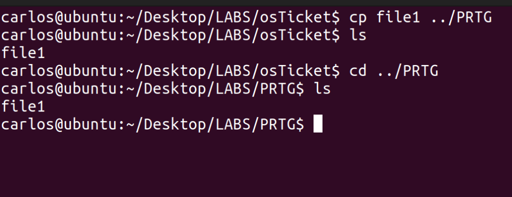 Additionally, you can see from the screenshot how crucial the ‘../’ syntax is – I tried to change my directory to osTicket, which is adjacent to the PRTG folder, but Linux couldn’t find it. I had to get “out” of the PRTG folder to its parent, LABS, so that Linux could find the osTicket folder. There, you can see that the “file1” folder was moved there successfully and was no longer in the PRTG folder.