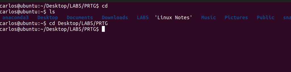 ./ = current directory. Linux does not read minds, so when you run a command, it ALWAYS checks the current directory first. You must use ‘../‘ to LEAVE the PRTG folder and go to the parent folder (LABS). If you wanted to go to the parent of LABS, you’d need ‘../‘ twice (../../). If you wanted to go all the way back to home, you’d need to use ‘../’ three times (../../../)-in this case because the file path is Home/Desktop/Labs/PRTG – or you can use ‘cd ~‘, or simply ‘cd‘. In Linux, “~” = home.