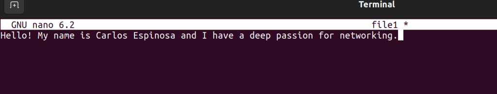 The “nano” command allows you to edit any file and add text to it. In the two images above, you can see me using nano on file1 to write a sentence into it when it was previously empty. Nano will open any file you use it on, but if the contents are binary (images, executables, etc.) it will just look like gibberish -though it won’t break anything in the file.