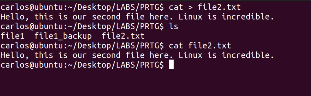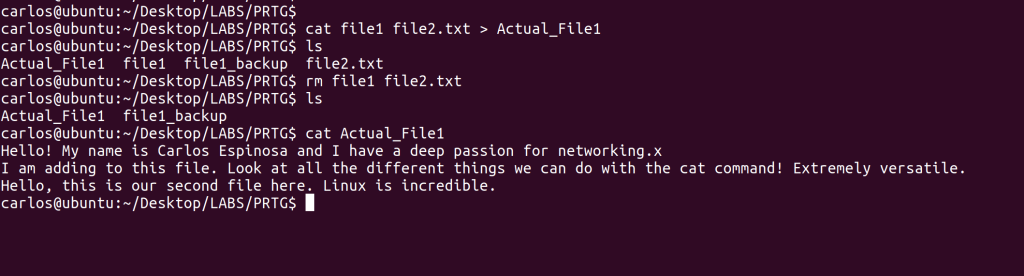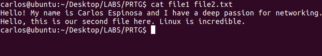 In the last image above, you can see that another of the command’s functions is to combine multiple files into one, and you’re able to name that file to whatever you’d like. You must use ‘>’ for this ability. It does NOT delete the individual files that were combined. I also used cat to verify that both files’ contents were in the newly created one.