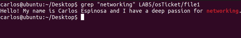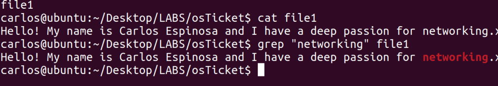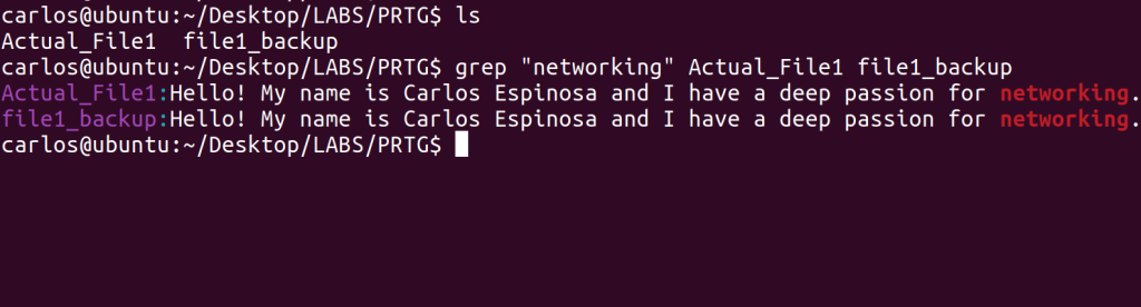 You can also grep multiple files simultaneously as evident by the second image above. I was looking for any sentence that contained “networking” within two specific files and it gave me the sentence output from both Actual_File1 and file1_backup. So just like “CTRL F” on Windows, you’d use this if these files had a large amount of text within them. The third image just showcases how the system highlights your keyword in red when you are trying to find it through grep.