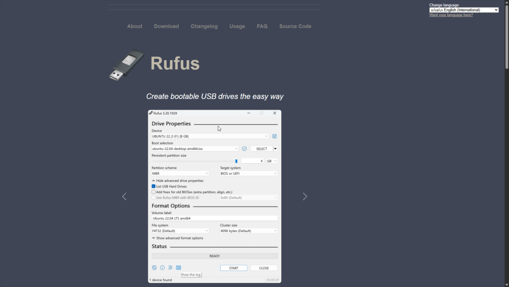 Now, we go to https://rufus.ie/en/ and download Rufus itself as shown in the image above. Rufus allows us to create bootable USB drives, so when you plug it into your machine, your machine boots from it instead of your disk!