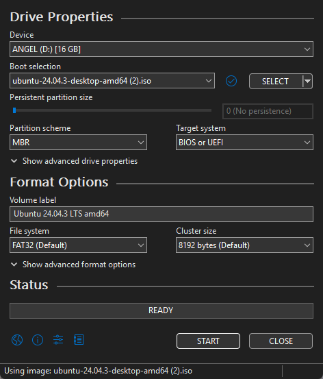 Back into Rufus, find the ISO image you just downloaded of Ubuntu and prepare to click ‘Start’ at the bottom. WARNING: When you reformat a USB, ALL data within it will be permanently deleted. Ensure nothing important is on the USB. After this process is complete, your USB is now a bootable installer. It is used as a medium to allow your system to install Linux.
