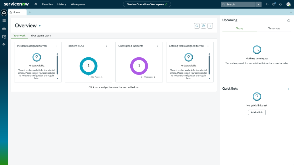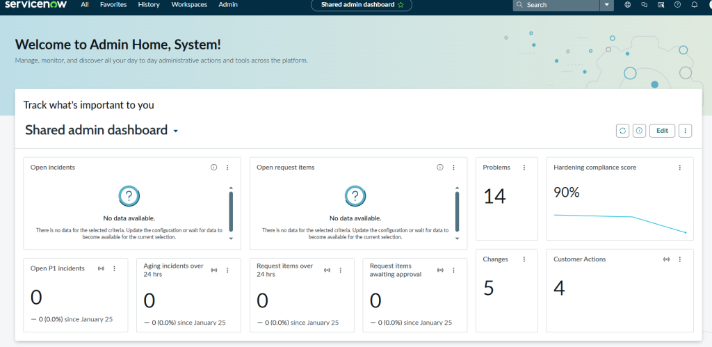 This is the dashboard you would typically encounter using ServiceNow. The great thing about it is that it’s completely customizable; you can choose which specific alerts, metrics and widgets you’d want displayed that is relevant to your role. I’ll edit this dashboard later in this blog.