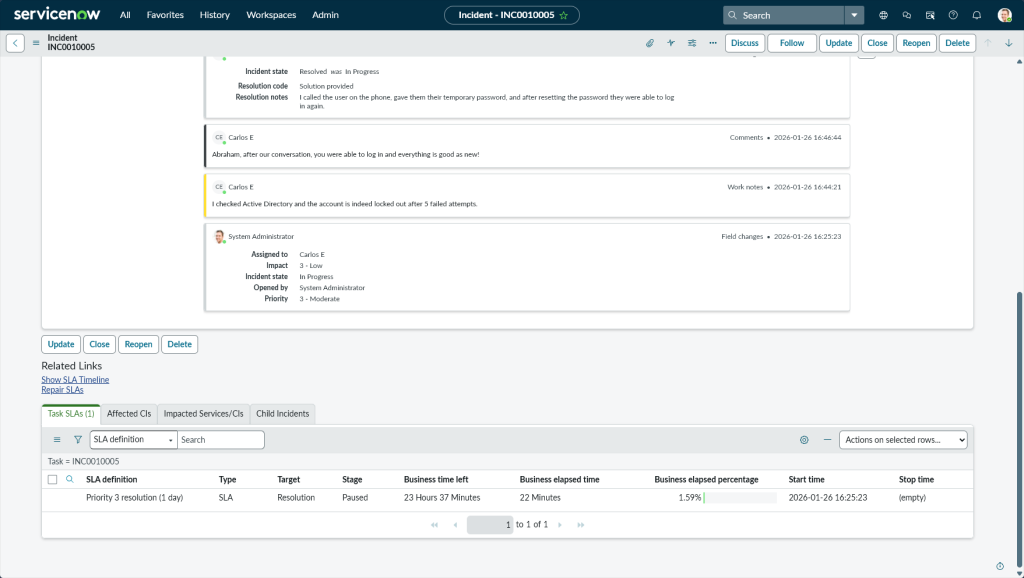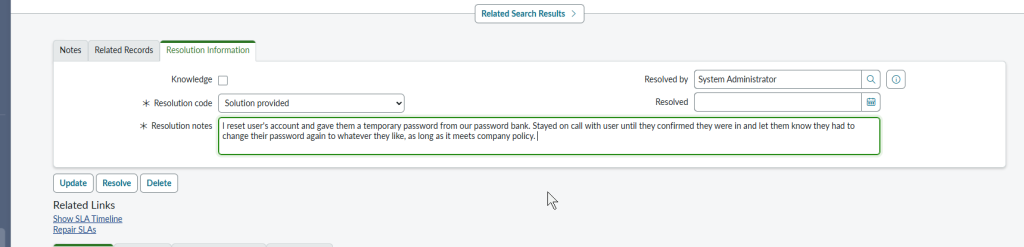 After resolving the ticket, I had to input a resolution code and a resolution note explaining how the issue was fixed. SLA is paused to the right, once a ticket goes to the “Resolved” state the timer pauses.