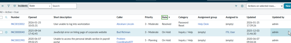 The image above shows all open incident currently in queue. This view displays the ticket number, when it was opened, a short description, the user who requested it, the priority, state, who it’s assigned to, when it was last updated and more.