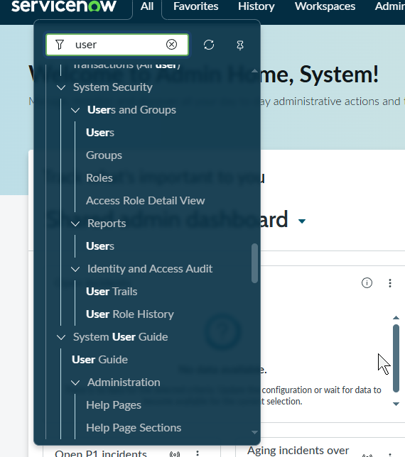 In the images above I filtered for ‘users’ and ‘incidents’. Look at all the different options that appear with just one term which brings me to an important concept: everything in ServiceNow – and I truly mean everything – exists in its own unique module. Viewing the list of users is in a completely different location than creating a new use, which is separate from managing user roles and so on. The same applies to incidents and any other variable you can think of. Once you learn the Filter Navigator, you can find anything in seconds.