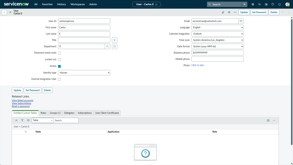 Note: In a real environment, you’d rarely create user profiles manually within ServiceNow. Instead, you would use LDAP integration to sync automatically with your Active Directory server(s).