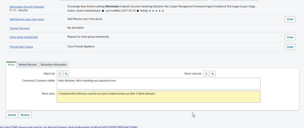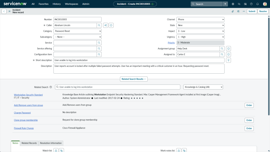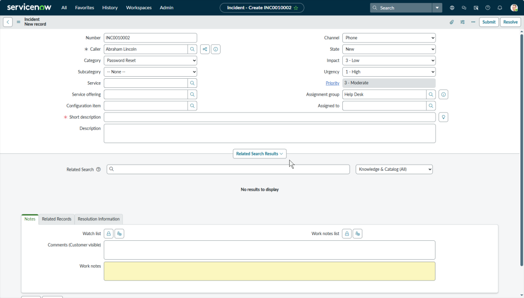 The image above shows the latter. Abraham Lincoln called the IT department and I, as the IT technician, am creating a ticket for him requesting a password reset. Notice all the different fields available – caller, category, priority, assignment group and more.