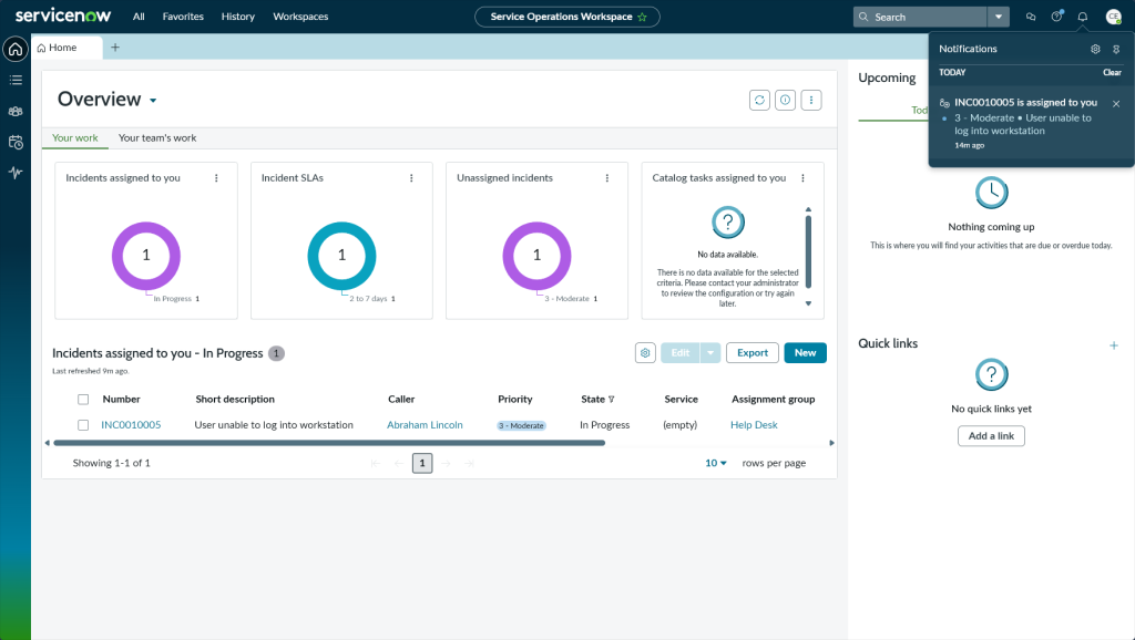 I can also see incident SLA metrics and unassigned incidents sitting in the queue. Notice the notification alert on the top right.