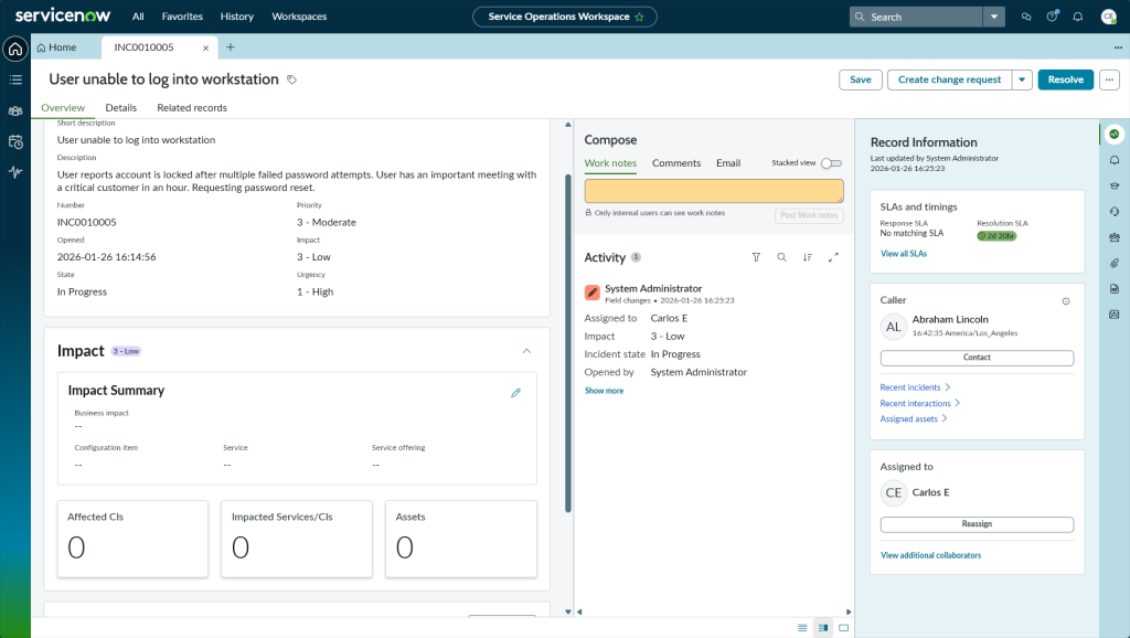 In the middle column under ‘Compose’, I can write work notes, which are internal only. The user who called in this incident would not be able to see it. This is strictly for the IT team to document troubleshooting steps, observations and/or notes for escalation.