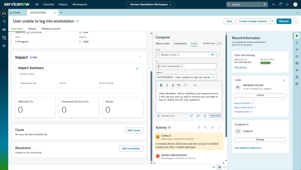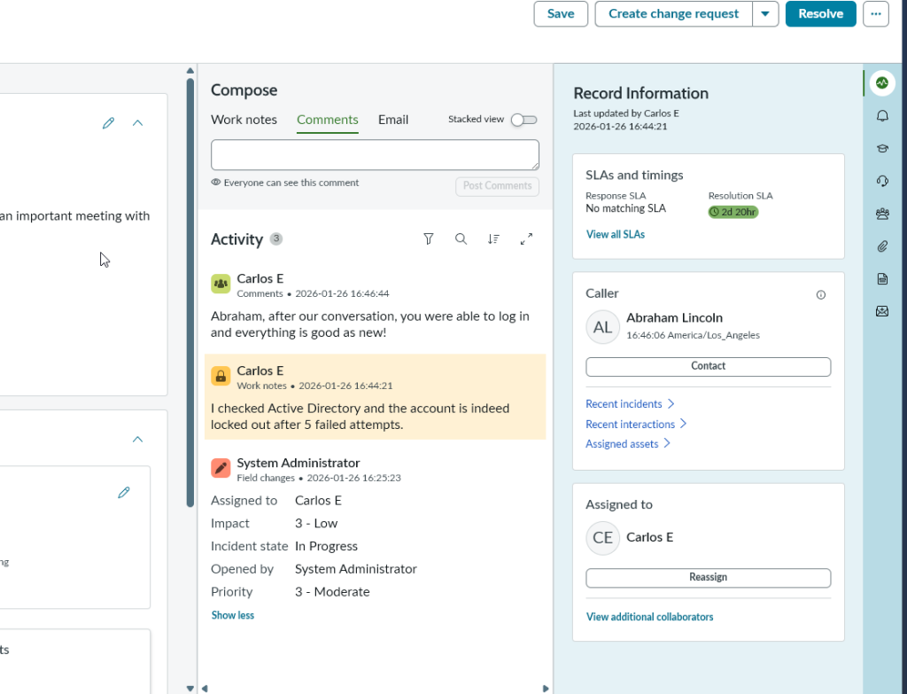 Even though the system assigned this as a Priority 3 incident with a full business day to resolve, I knew from the ticket details that Abraham had a critical meeting within the hour. Organizations can have a defined criteria for classifying impact and urgency (single user issue is low impact while a department-wide issue is high). SLAs are mandatory targets but as a technician, we still need to read the context and apply judgement. A single user locked out before a major meeting is not the same as a single user who cannot connect to the Wi-Fi. In hindsight, I should have set both impact and urgency to high making this a Priority 1 ticket.