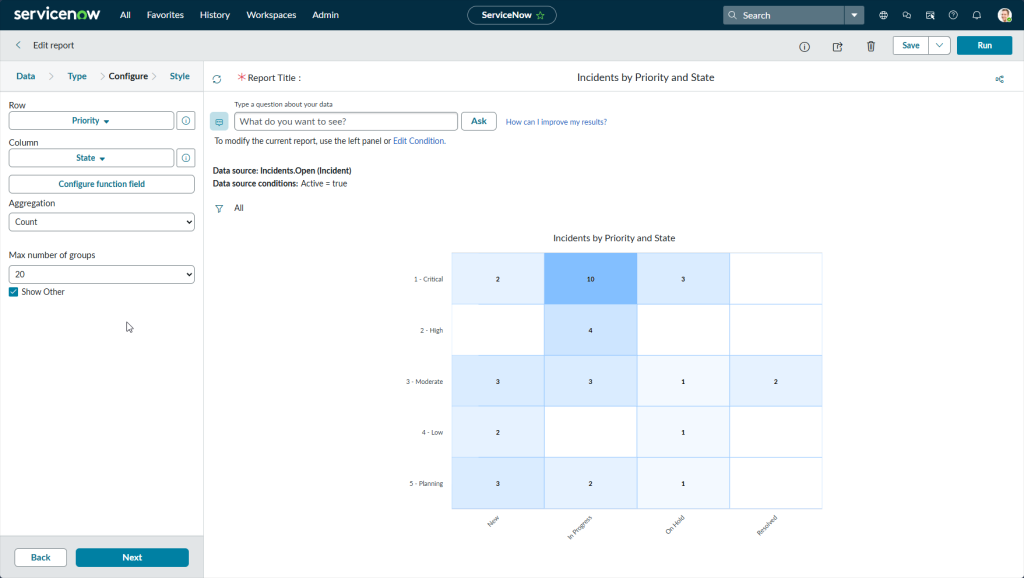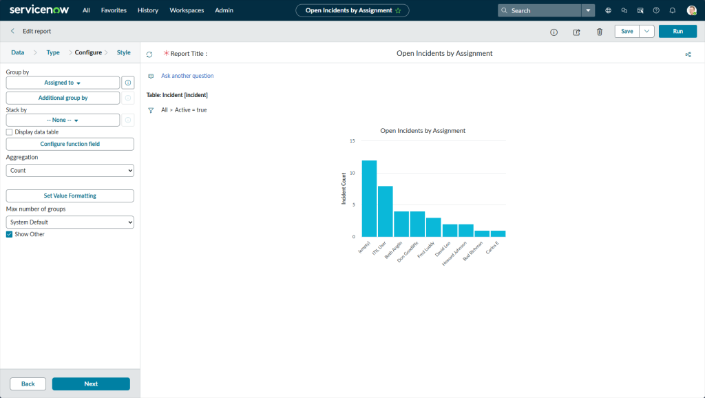 One of the most valuable features of ServiceNow is the ability to run reports on practically any data you need. In the first image above, I ran a report showing open tickets and who they were assigned to. This allows a manager to visualize ticket data for workload balancing and identifying bottlenecks. Is one tech overloaded while others have capacity? Are there too many tickets unassigned?