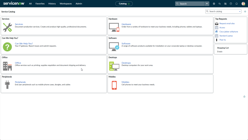 The image above shows the “Service Catalog” which is what end users see when they log into ServiceNow. There is no complicated backend or overwhelming options – just a clean and simple interface. Using this catalog, users can request new hardware (laptop, mouse, etc.), browse what software are available, or submit tickets and report incidents.