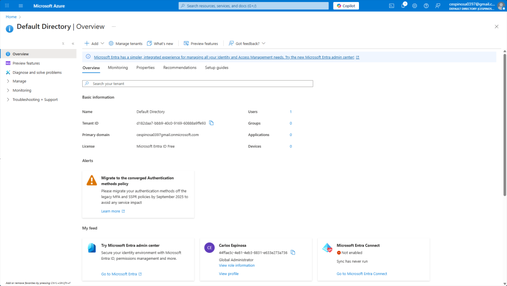 There are banners throughout the interface prompting me to try out the Microsoft Entra admin center. Let’s switch over to that modern portal and continue from there.