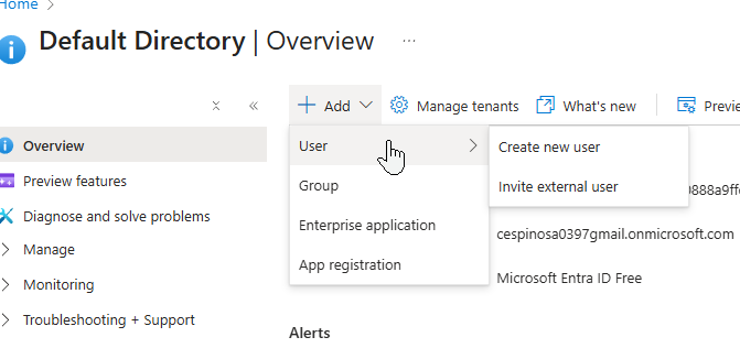 Digging deeper into that ‘Add’ button, you’ll notice you can also invite external users. In Entra ID, having the option of external users is useful for granting people outside your organization (contractors, vendors, etc.) with limited access to your tenant enabling collaboration. They authenticate through their own organization’s identity provider.