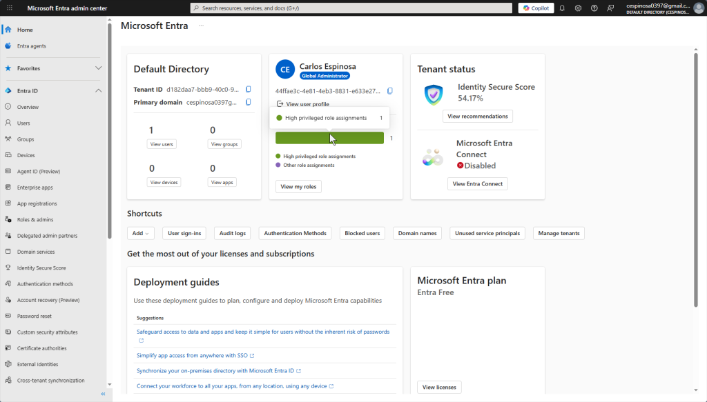The Identity Secure Score provides recommendations and insights to strengthen your tenant’s (equivalent to the ‘forest’ in previous AD labs) security posture. Azure analyzes what your current configuration looks like and suggests improvements such as enabling MFA or configuring Conditional Access policies.