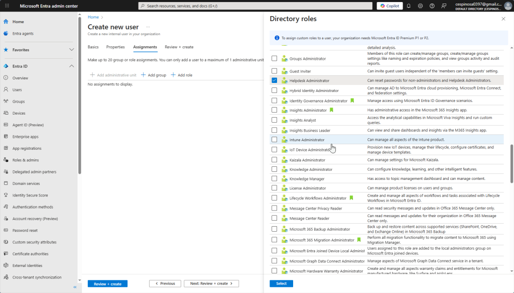 Here you assign the role you want this user to have. We want them to have all the capabilities of a Helpdesk Technician but nothing more – implementing the principle of least privilege. As such, we’re giving this user the ‘Helpdesk Administrator’ role, allowing them to reset passwords and manage basic account issues for non-admin users.