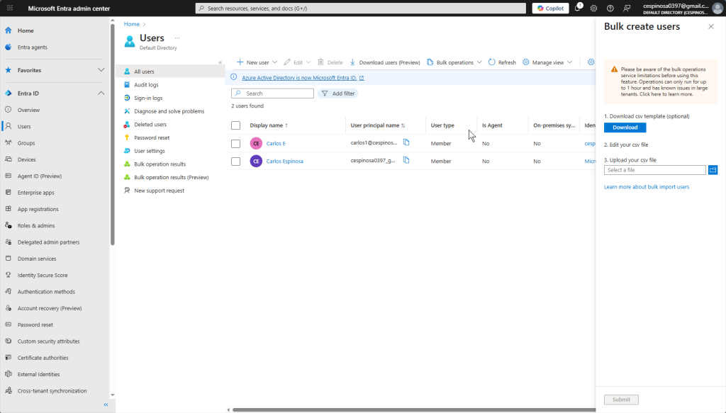 This shows the bulk user creation option we discussed earlier. Using Microsoft’s CSV template, you can create multiple users at once instead of filling out the form individually for each one. (ss this file).