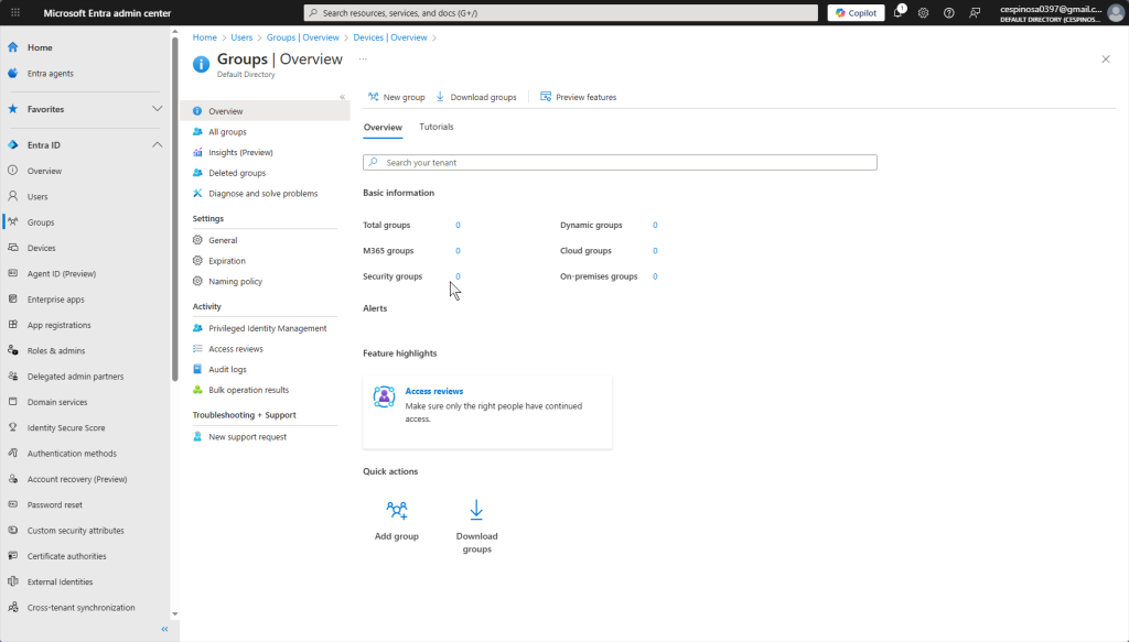 This is the Azure portal view of Entra ID, still labeled as “Default Directory” in the older interface. Some things I want to explain: Here you can see all of the users, groups, and even devices associated with this directory.