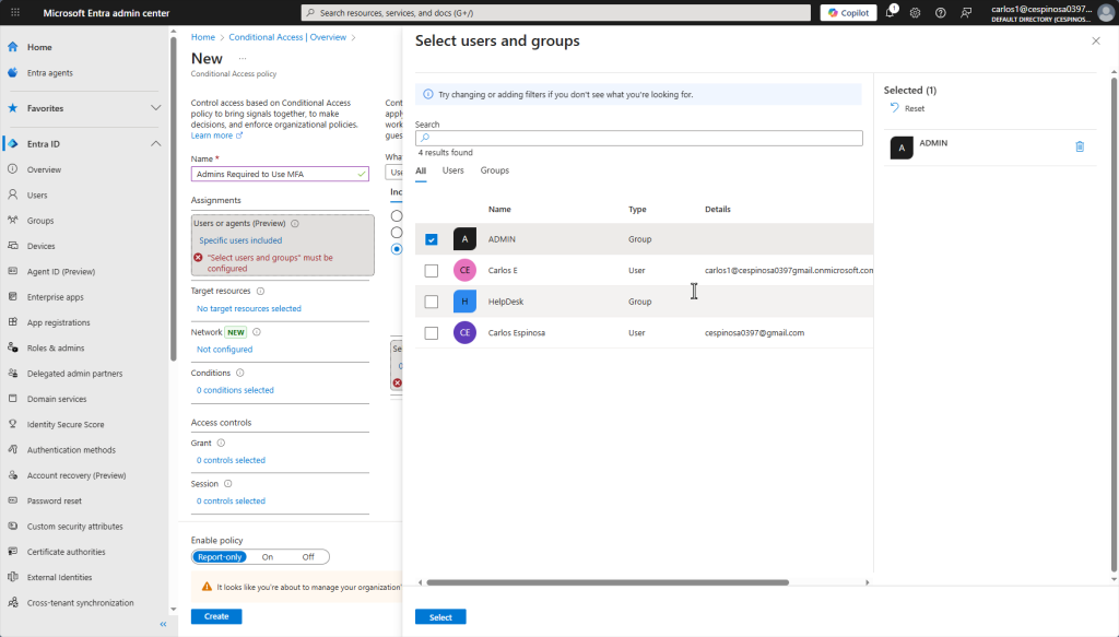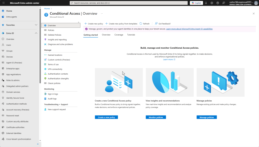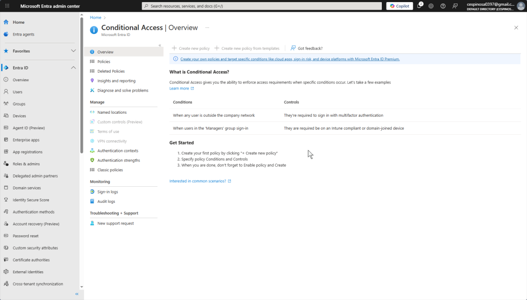 This is the Conditional Access dashboard where you can create, monitor, and manage policies. This essentially replaces the security-focused GPOs we configured on prior on-prem AD projects – but with more flexibility since policies evaluate conditions in real-time based on user, location, device, and risk level.