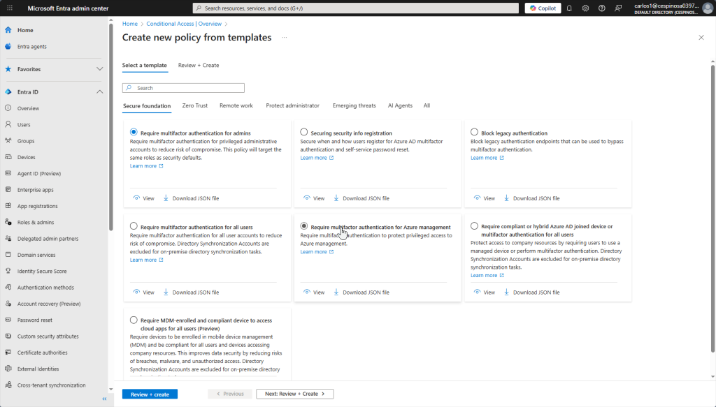 You can create policies from pre-built templates that the portal provides. We’ll be using the GUI since that’s what most admins use this but you can also automate policy deployment using scripts or JSON files (text-based configuration files). However, I want to showcase creating a new policy from scratch so we’ll skip the templates.
