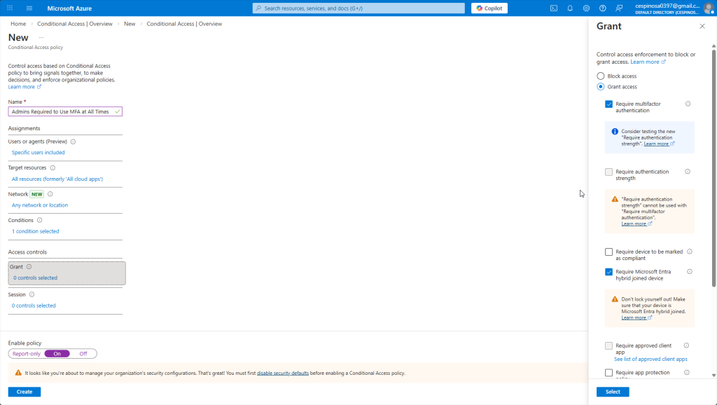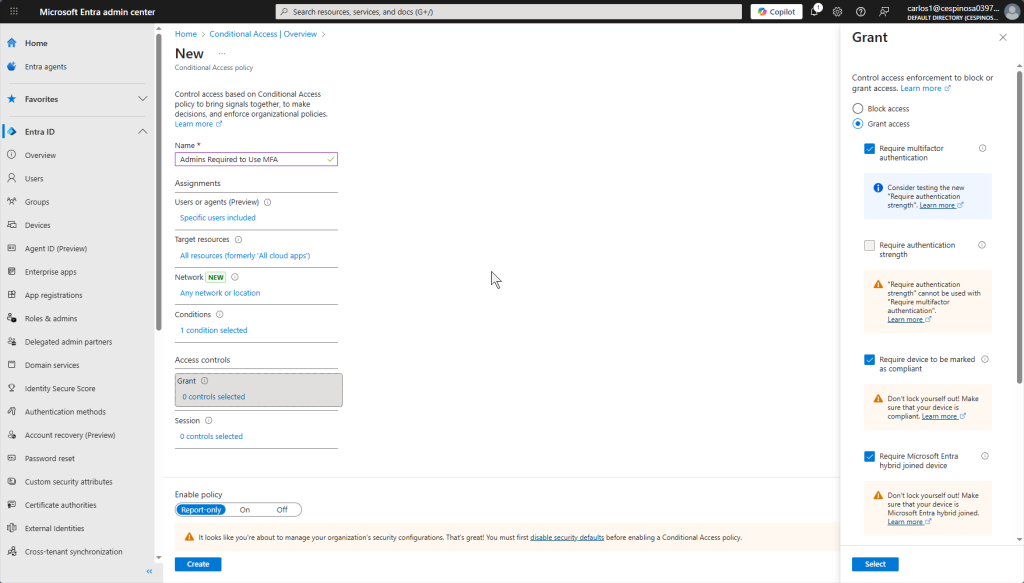 Since we want our admins to always require MFA regardless, we check ‘Grant access’ and ‘Require MFA’.