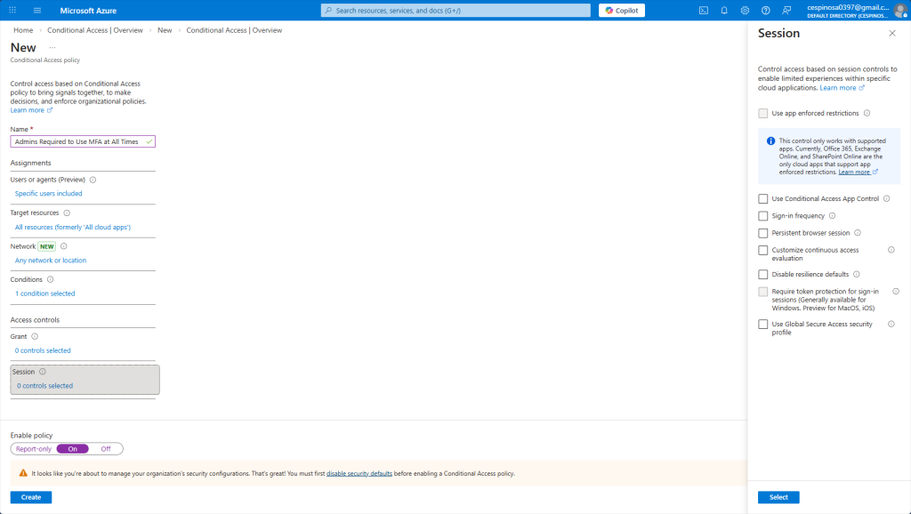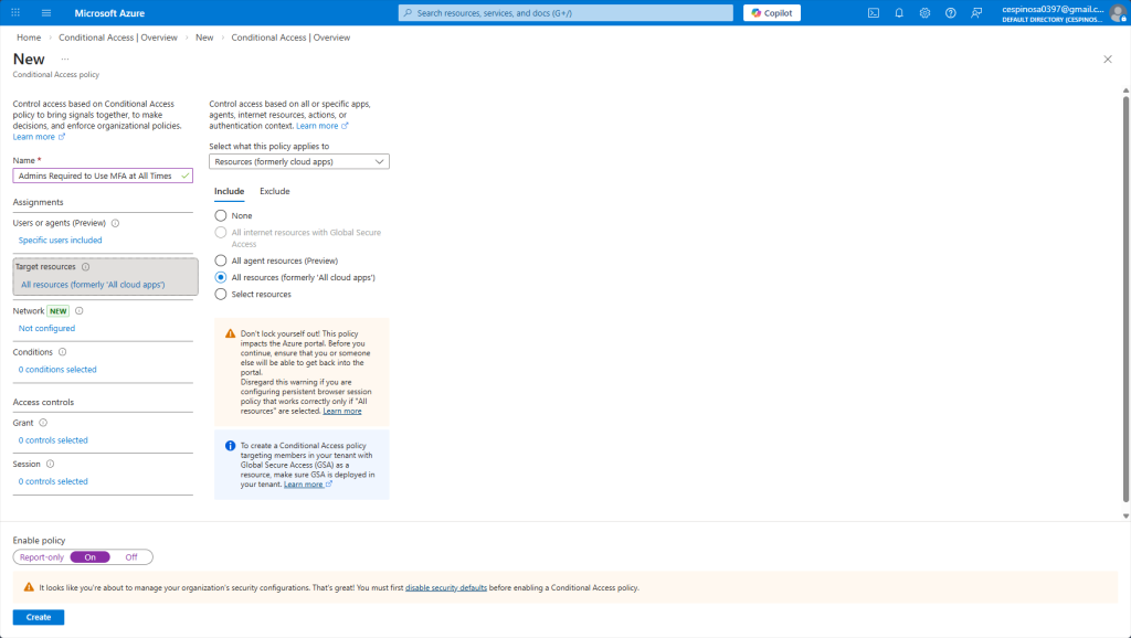 Here I am specifying that this policy applies to every resource the admin would sign into. Notice the warning: Azure is reminding us to ensure we still have a way to access the tenant so we don’t completely lock ourselves out. Sometimes, you may have an emergency account that is excluded form all Conditional Access policies which has its credentials stored somewhere securely offline and ONLY used as a last resort.