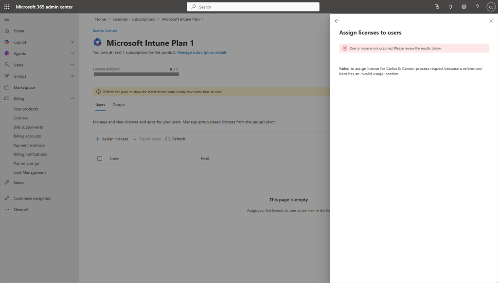 Another thing: You must set up a usage location on the user account before you can assign licenses as shown below. Small detail that is easy to miss but it’ll block you until it’s fixed.