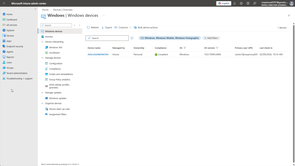 Within the Intune admin center, I can see various metrics and reports. Devices are organized by platform (Windows, Linux , etc.). As you can see, we have my computer which I enrolled into Intune under the Windows platform.