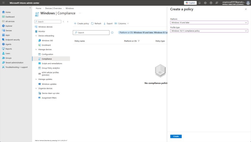 Here, you can see the newly created Compliance Policy under the Windows platform, ready to evaluate devices on their next check-in.