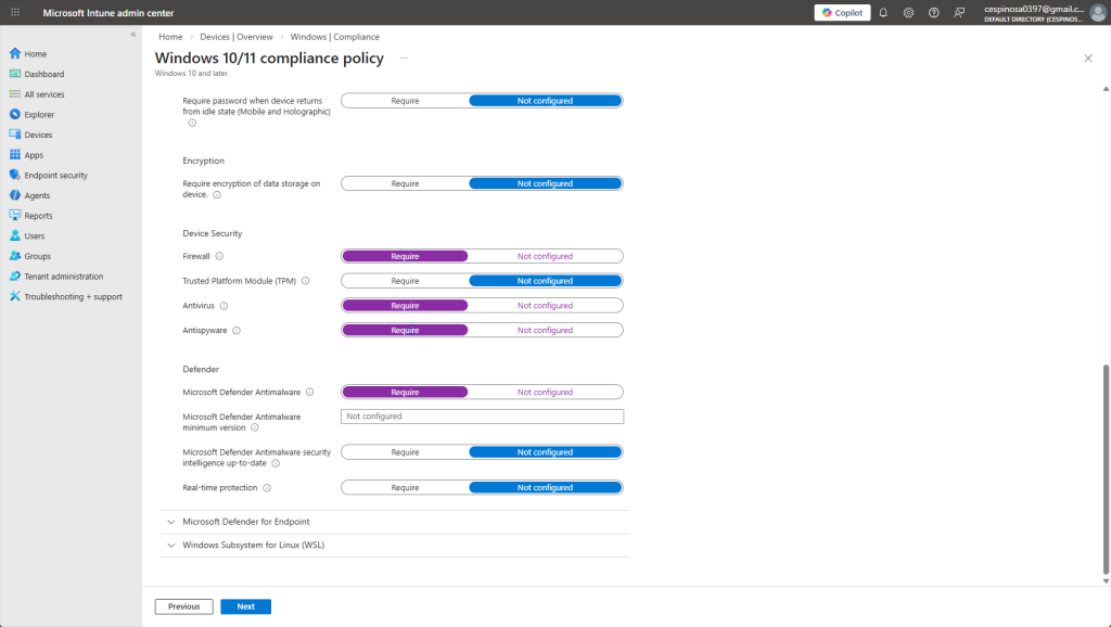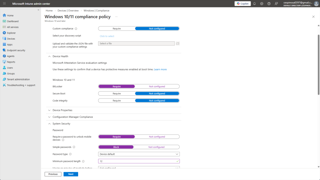 Here are some of the compliance settings you can enforce on enrolled devices. You can require BitLocker encryption, mandate firewall and antivirus, enforce password complexity, and even set a minimum OS version as well as much more.