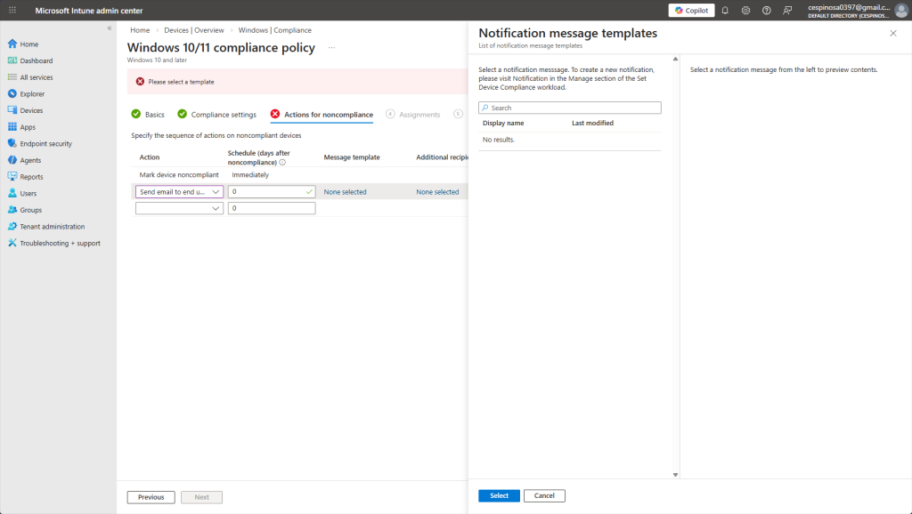 Here, you can configure what happens when a device fails compliance. Intune allows you to define actions for noncompliance such as marking the device noncompliant immediately or sending an email notification to the end user. In fact, I would even be able to set a schedule such as marking the device noncompliant after 3 days of failing.
