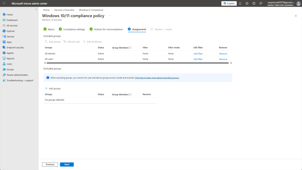 In this part of creating a Compliance Policy, we can assign the policy to groups or users. Since this is a baseline security policy requiring a firewall and basic protections, we’re going to assign it to all users as every single enrolled device should meet these standards.