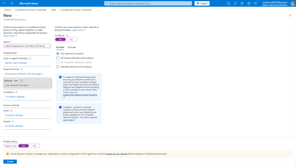 Here I’m configuring the policy to apply regardless of network location – whether the admin is on a trusted corporate network or an untrusted one, MFA is still required.