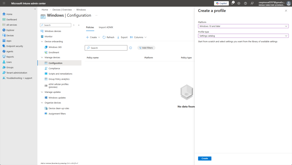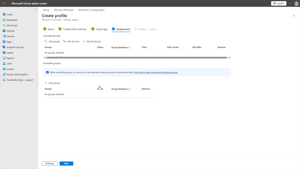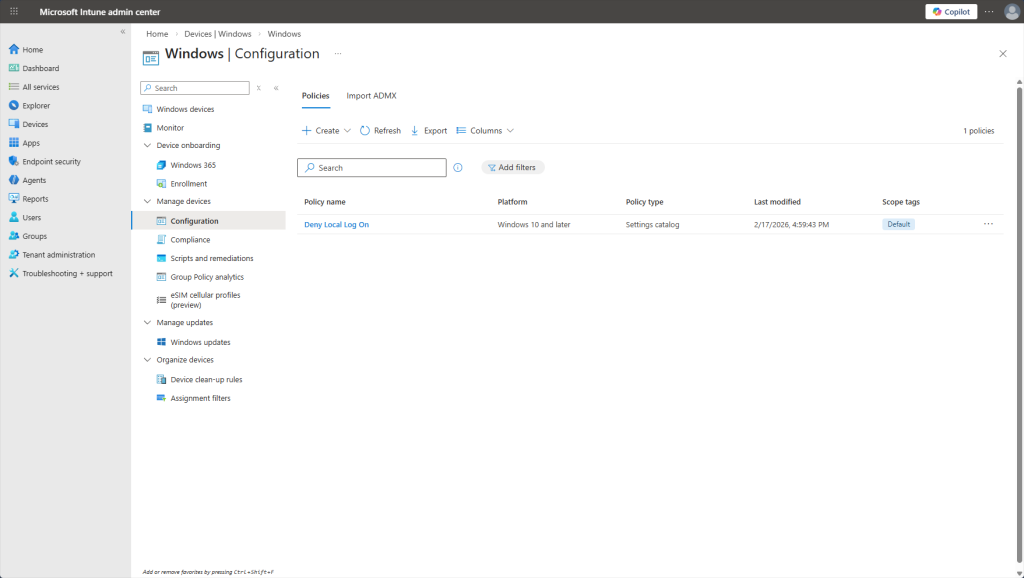 Additionally, note how there are no noncompliant devices, no deployment errors, or any configuration policy assignment failures. That’s expected – we haven’t configured any policies yet, so there’s nothing for devices to fail against.