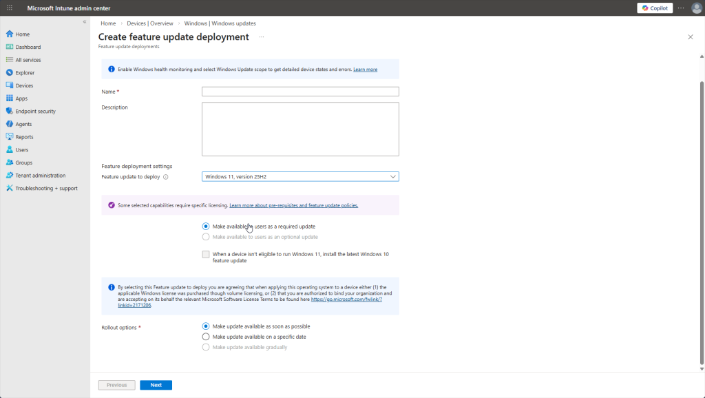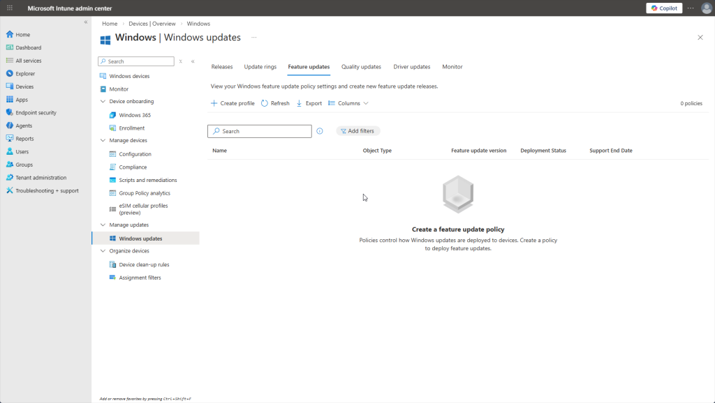 Worth noting: under “Manage updates” in the sidebar, Intune gives you centralized control over Windows Updates. You can create “update rings” to control when updates are deployed like deferring certain updates for 30 days so you do not have to deal with a buggy release and wait for patches. You can also expedite critical security patches, push specific Windows versions to devices, and even pause updates if a bad patch is causing issues. No more relying on end users to click “Update and Restart.”
