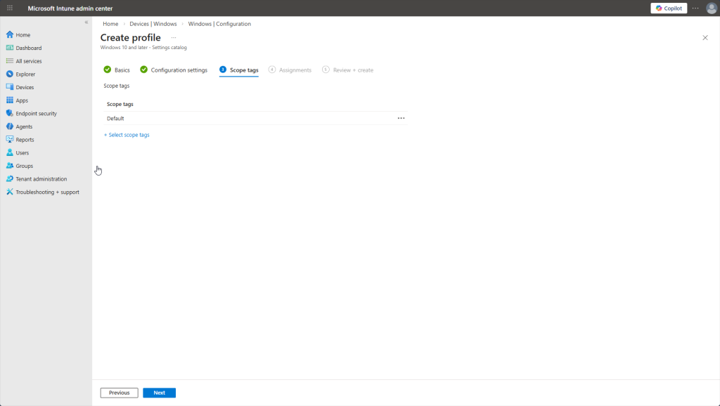 The next step in completing this Configuration Profile is to add a ‘scope tag’. After research, this section is for enterprises with users/devices that span multiple geographies. Scopes are used to tag policies and devices with a designated region. Therefore, admins in Europe won’t be able to see policies that are tagged with a U.S. scope! Not necessary for us here.