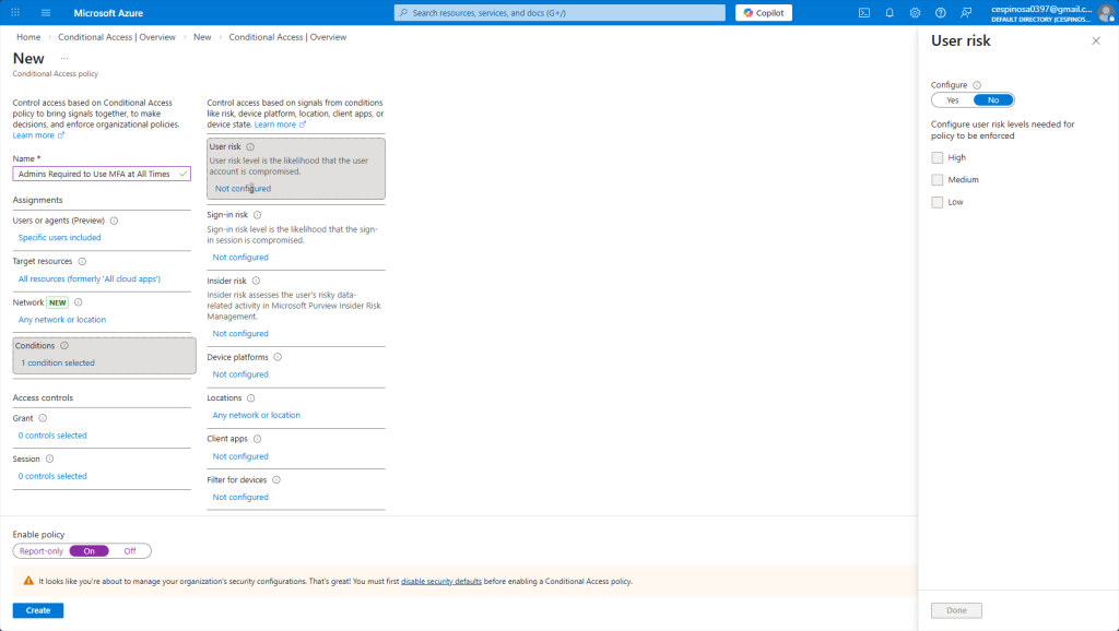 These are additional conditions you can configure to achieve even more granular control – factors such as user risk, sign-in risk, device platform, location, and more. Azure actually monitors user behavior in the background at all times and compares it to their normal patterns (like a user downloading 20GB of data instead of their usual 5GB), and with this data, Azure learns from patterns and can raise their risk level causing your policy to react accordingly. Azure independently calculates risk through different factors and categorizes it as: Low, Medium, or High. If you set the policy to be enforced when a user reaches Medium risk through Azure’s calculation, then it is triggered at Medium or higher.