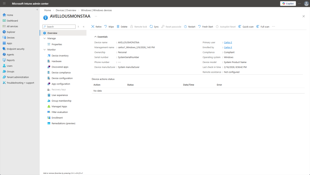 Within the Windows devices section, we can see all of the enrolled Windows devices at a glance: device name, assigned user, compliance status, OS version, last check-in time, and more. Clicking on a device lets me view detailed hardware info, installed apps, and even perform remote actions like restart or wipe.