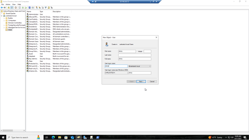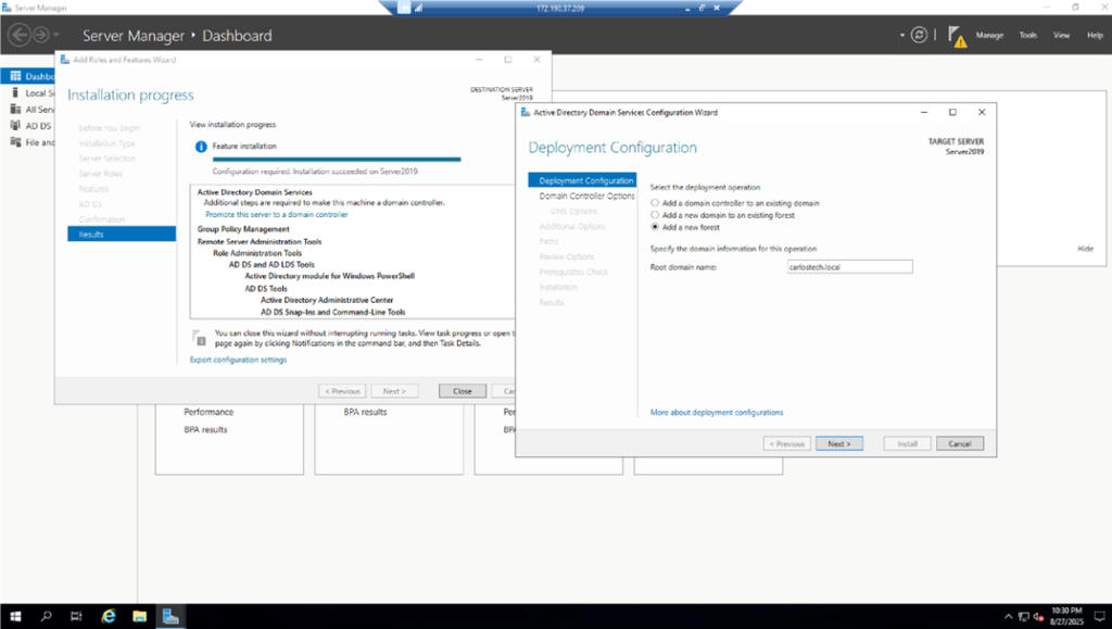 Domain Controllers are the authoritative servers for AD. The changes you make here populate to all other servers and hosts within the domain you configure. If this fails, you are in big trouble. It’s vital to have redundant DC’s (Azure actually provides you with a set of 2 automatically when you use Entra ID, which is AD for Azure). The root domain we configured was “carlostech.local”, which means this is the domain I want all the users, computers and servers to join to. We are using .local in the forest because this is a local project that will not propagate the Internet.
