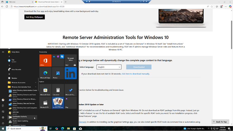 Remote Server Administration Tools were deployed on the Windows 10 client workstation to demonstrate secure remote management principles: