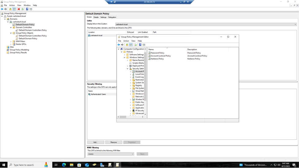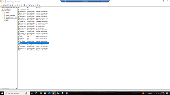 Domain Administrator Account: The initial server administrator account (which we created called ‘helpdesk’) was automatically elevated to the ‘Domain Admins group’ during Active Directory promotion, providing administrator privileges across all domain-joined systems. This signifies that this account now has local administrator rights on every machine within the ‘carlostech.local’ domain, demonstrating the security significance of the Domain Admin group membership.