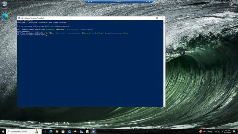 - Now, we only have to reference $Password in future lines. So with “New-ADUser -Name “Peter” -AccountPassword $Password” we created the user Peter with the password we just defined.