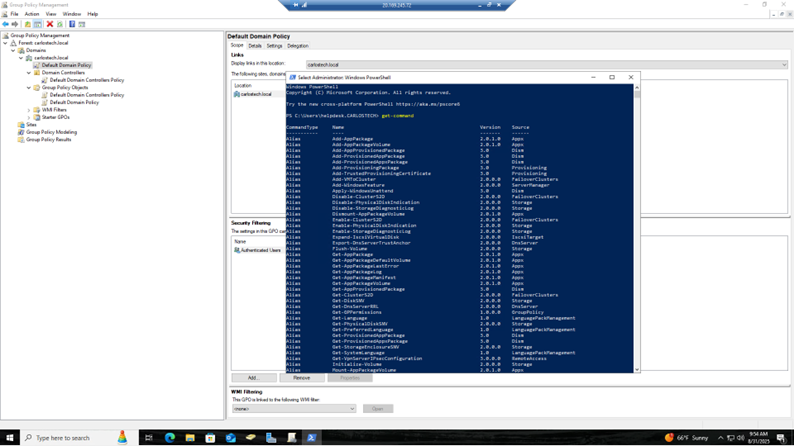 PowerShell has a certain syntax that you need to follow. Using the ‘get-command’, I can see all the available commands at my disposal and begin from there. Just like Python (a programming language), you would have to import certain modules to get access to commands that aren’t already there. Scrolling down, we see commands for Active Directory already there – so no need to import the module.